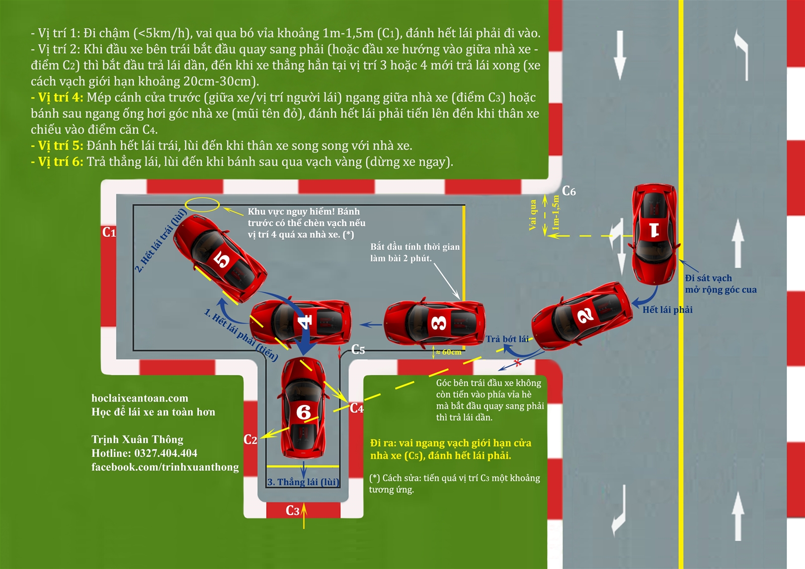 Bước 1: Đưa xe vào vị trí cách vạch giới hạn khoảng 30cm, dừng xe tại vị trí vai ngang giữa nhà xe (điểm C2).