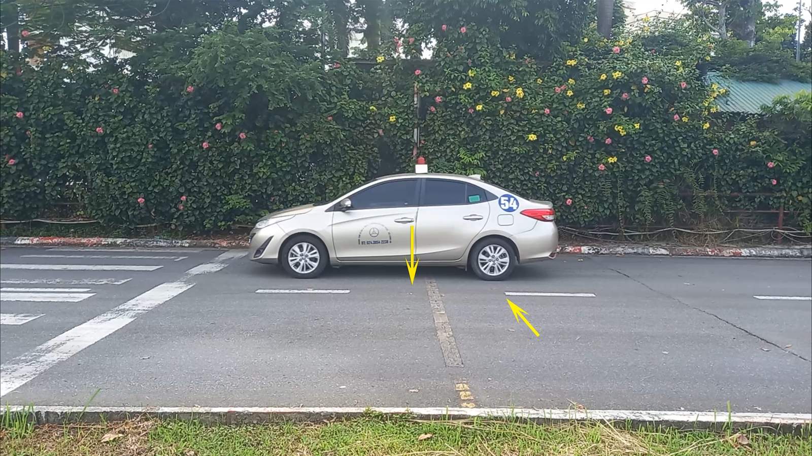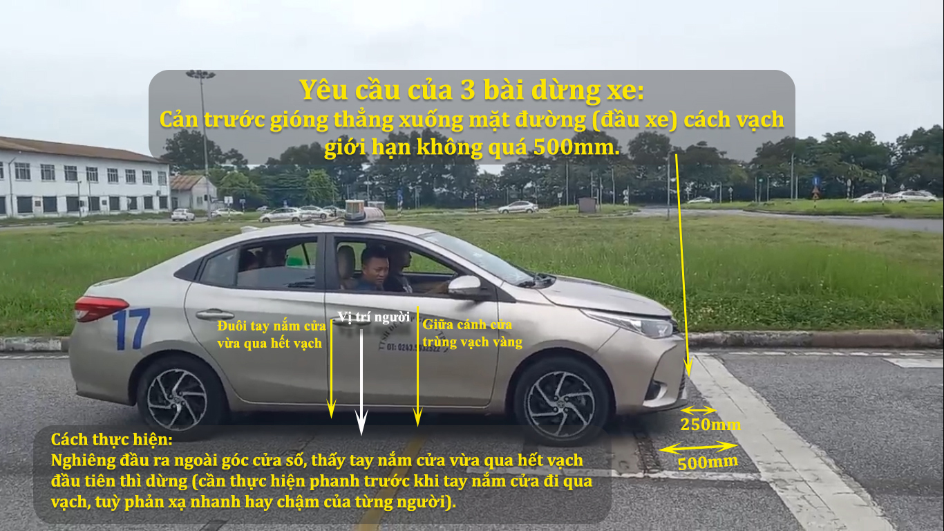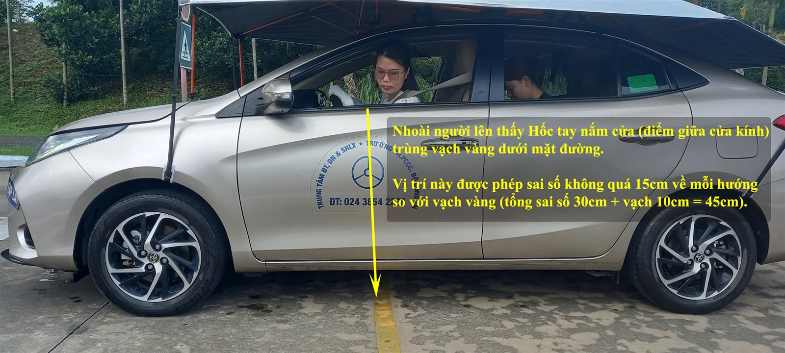 Hai tay cầm hai bên cạnh vô lăng, nhoài người lên cho mắt ngang hốc tay nắm cửa (giữa cánh cửa, mắt cách vô lăng 15cm-20cm), khi thấy điểm này trùng với vạch vàng trên mặt đường thì dừng lại. Bước này cần thực hiện phanh mạnh và dứt khoát, tránh để xe bị trượt lên.